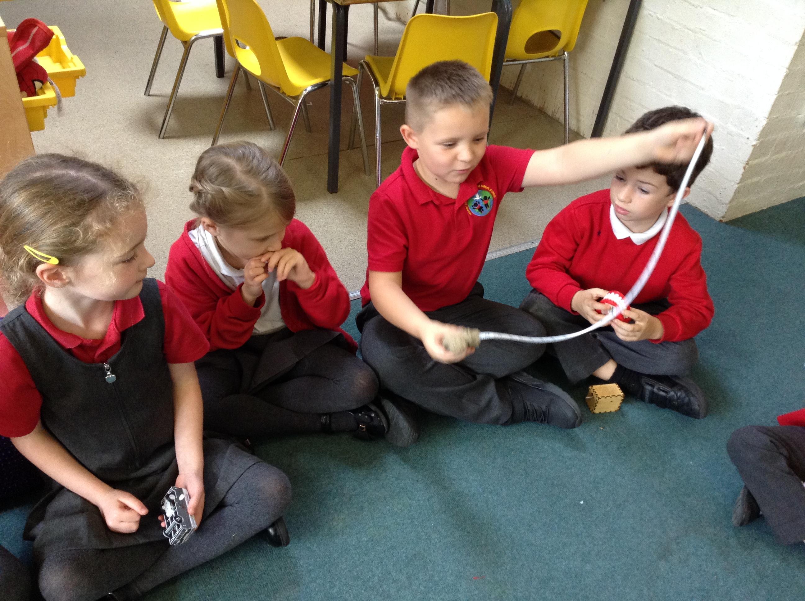 We began our DT learning this week and explored winding mechanisms. We looked at some around our school and shared some winding mechanisms we found at home. We then had a go at making a winding mechanism with a partner. In Science we explored ‘stretchiness’ and sorted objects based on if it was stretchy. We also enjoyed the Prazin’ Hands puppet show on Thursday which was about friendships.